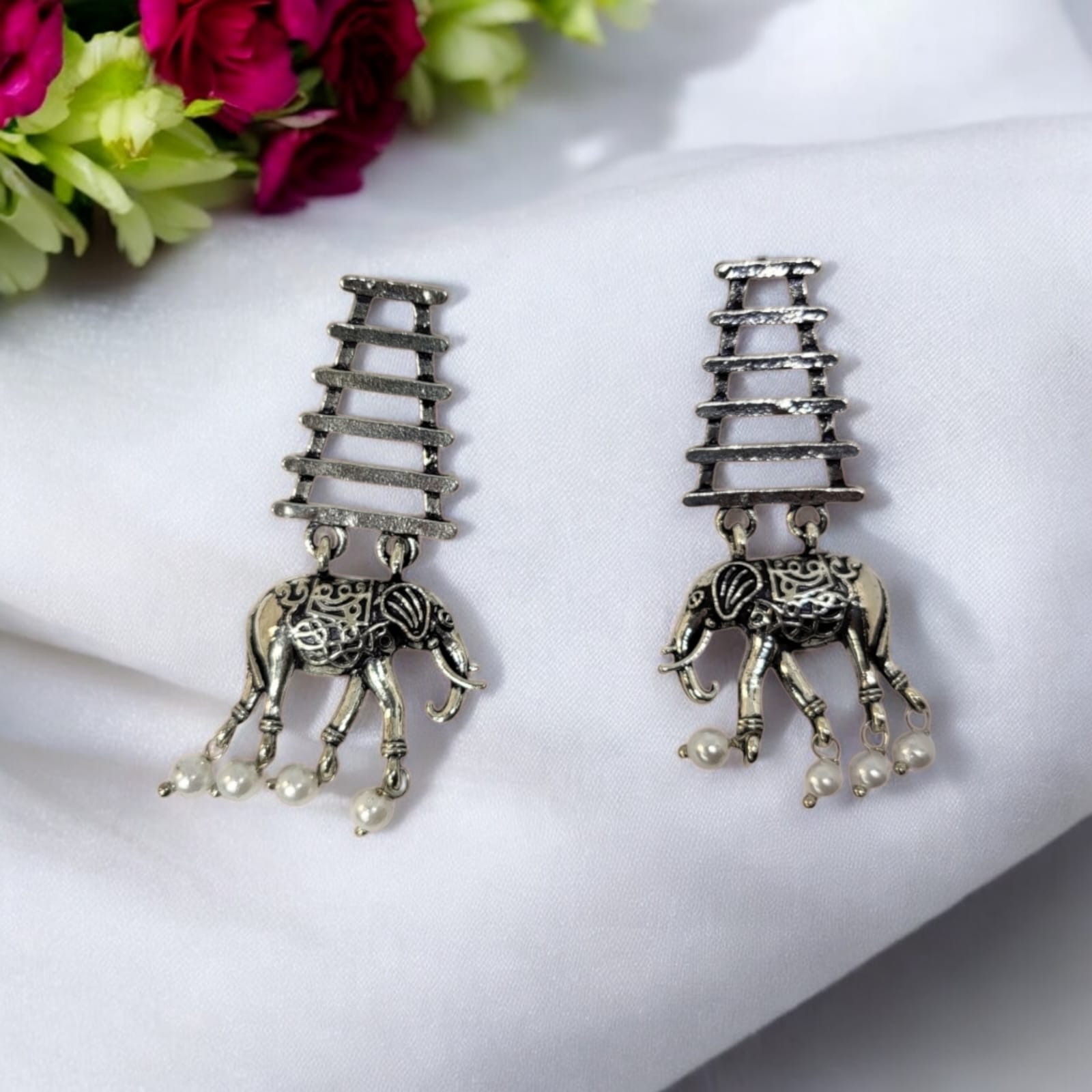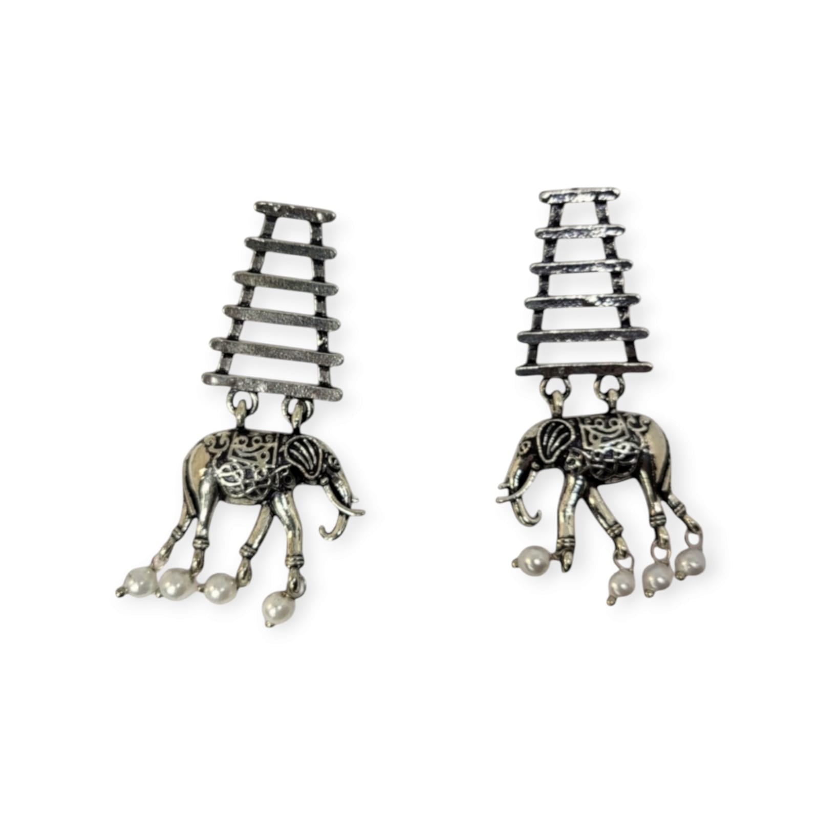 Showcase your love for unique craftsmanship with the MIDAM™ German Oxidized Silver Elephant Drop Earrings. Featuring intricately designed elephant motifs that symbolize wisdom and strength, these earrings add a timeless charm to any ensemble. Their vintage oxidized silver finish ensures versatility, making them perfect for both casual outings and festive occasions.