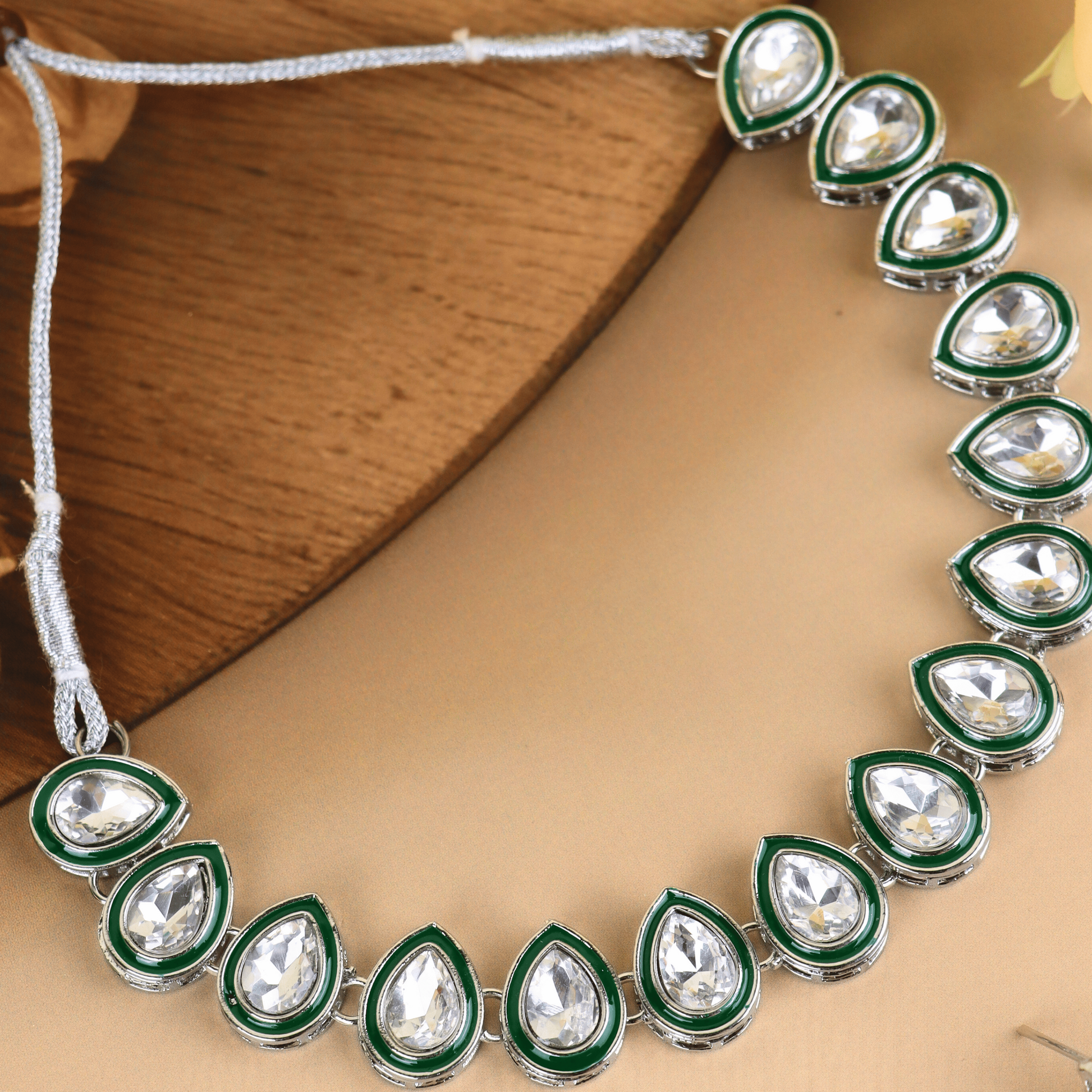 Make a regal statement with the MIDAM™ Silver-Toned Kundan Studded Choker Jewellery Set, a perfect blend of traditional elegance and modern sophistication. Featuring exquisite Kundan stones meticulously set on a radiant silver-toned base, this choker set exudes timeless charm. Designed to elevate both ethnic and contemporary outfits, it is an ideal accessory for weddings, festive celebrations, and special occasions.